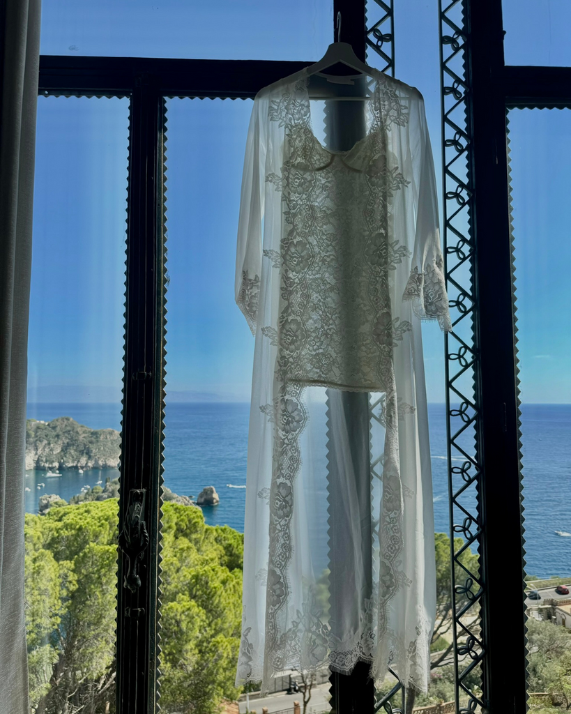 The beautiful Helena robe that made me feel romantic and confident! I live in Italy and I searched carefully for my long lace robe until I found Helena robe and I fell in love with it. For me it's the perfect getting-ready robes. It was a very special moment to wear that robe because it was the perfect way to start the day, feeling comfortable, beautiful, and completely in the moment before all the excitement began. I truly felt a REAL bride in it.