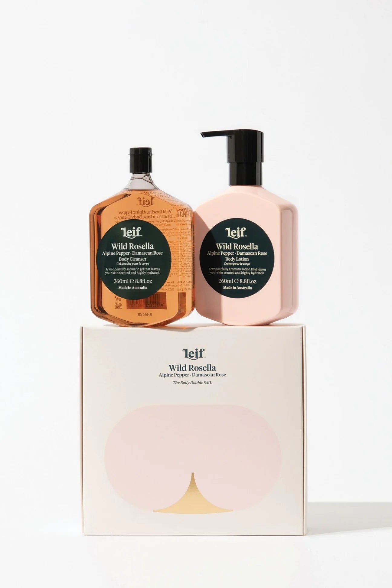 Leif's Body Double in Wild Rosella is the ultimate Valentine's Day treat. This heavenly duo of body cleanser and lotion, featuring our unique hibiscus blend, Alpine Pepper, and Damascan Rose, is beautifully boxed for the perfect gift. Cleanse and hydrate with a touch of enchantment.