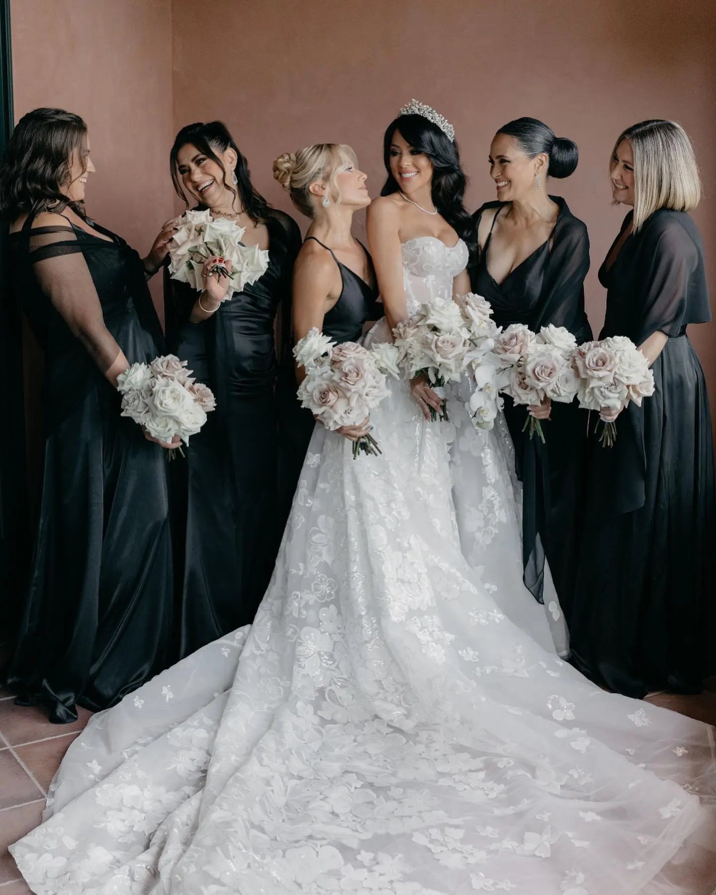 Vanessa alongside her gorgeous bridesmaids as they lounge in the Olivia Robe in the shade Blush.