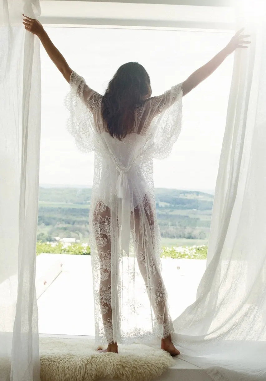 Delicate and bohemian, our Madonna Lace Robe is inspired by the Italian Renaissance. Lovers of lace will adore this beautiful bridal robe.