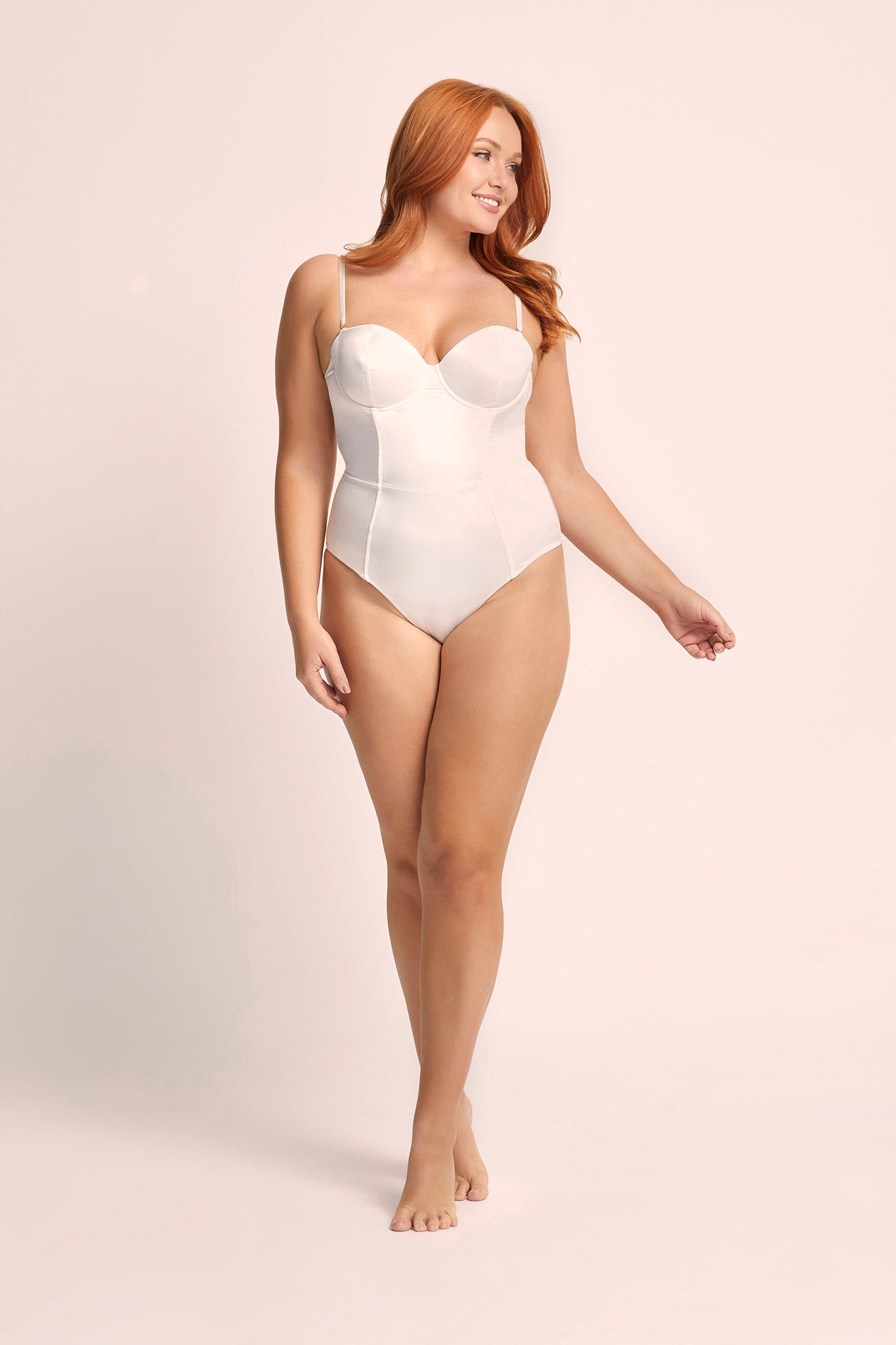 It boasts underwired molded cups, a lightly boned bodice, and an elasticated waist that work harmoniously to sculpt and enhance your natural curves. Whether you choose to wear it beneath a delicate lace robe or as an elegant addition to a simple outfit, this bodysuit is tailored to accentuate your figure with its form-fitting lightweight satin that delicately embraces your body. It's a true ode to your individual beauty.