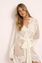 The silhouette features flowing kimono-style sleeves and a soft satin waist sash that defines the figure while keeping an effortless sense of ease. Intricate lacework frames the neckline, cuffs, and hem, creating a gentle contrast against the airy dotted tulle. Designed in Australia, the Chloe Robe captures the essence of bridal luxury — understated yet unforgettable.