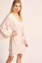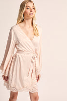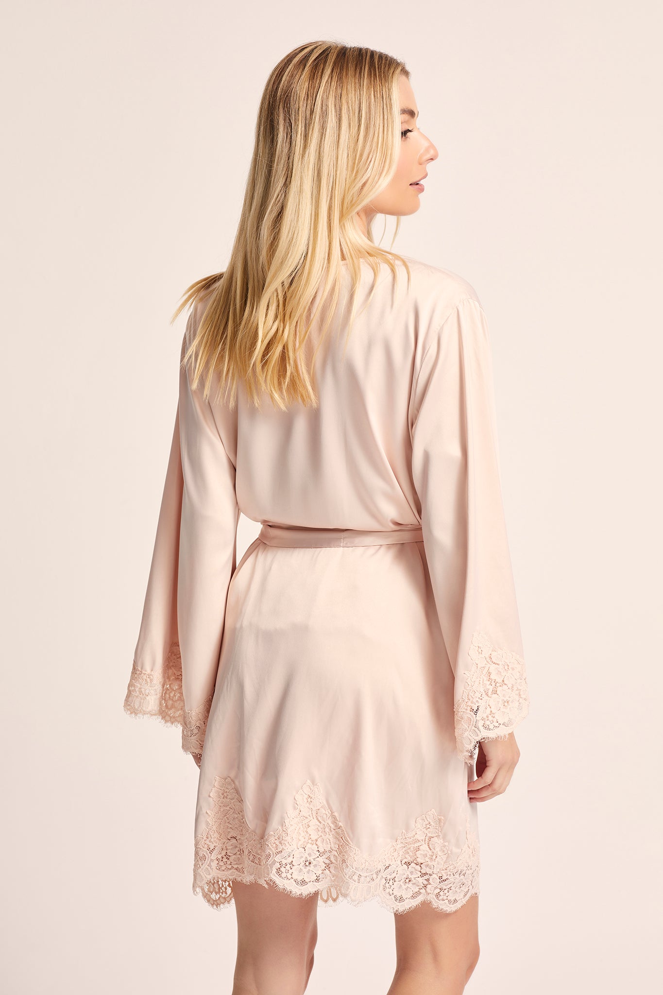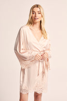 Indulge in the sheer elegance of our Sian Lace Robe in blush. Crafted from luxuriously soft satin and delicate blush lace, this robe offers both comfort and glamour.