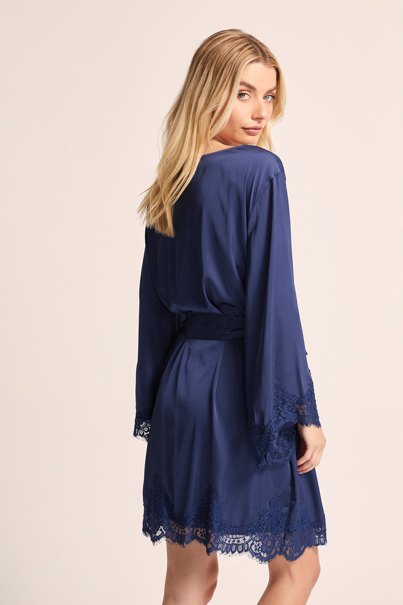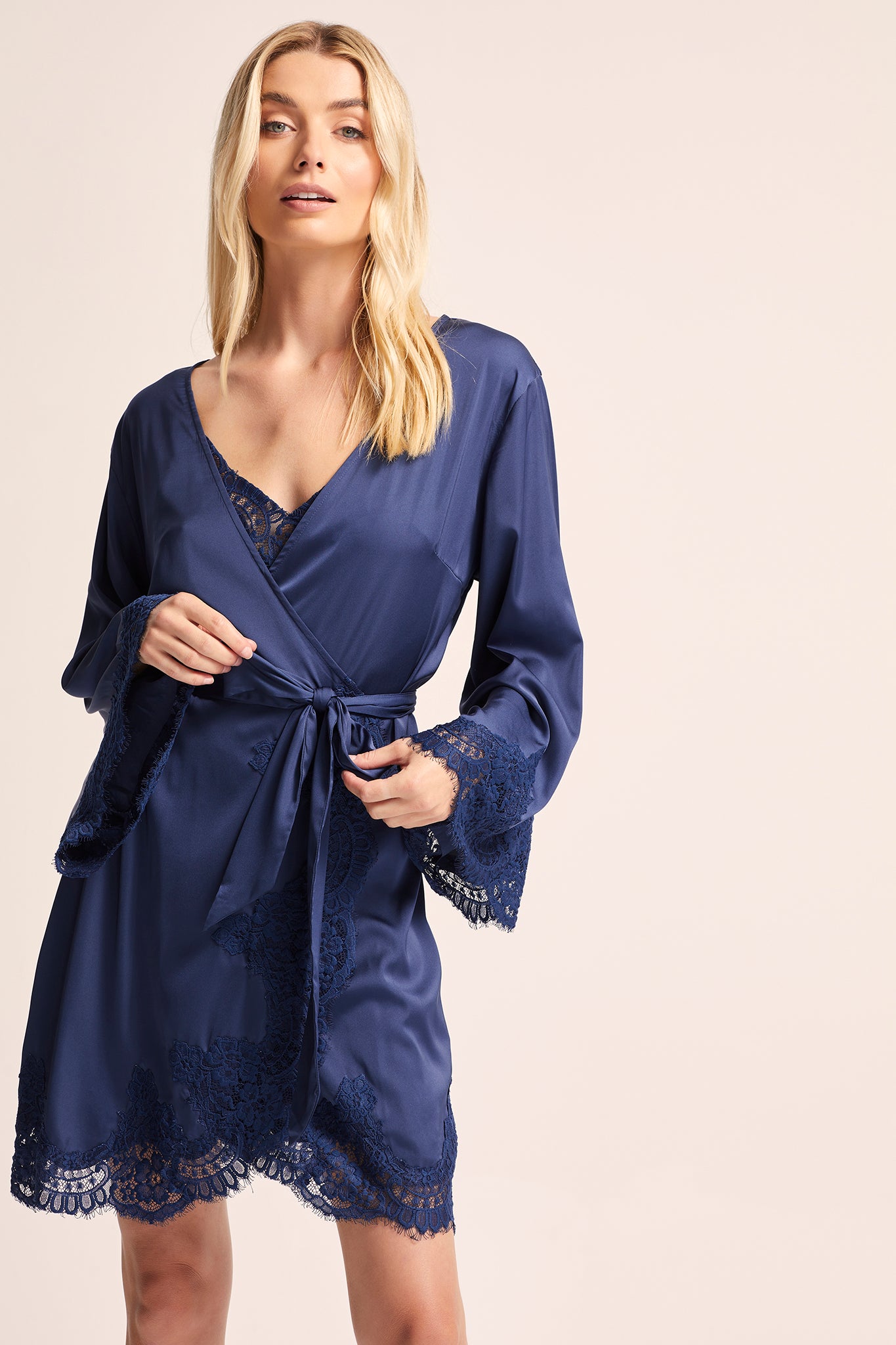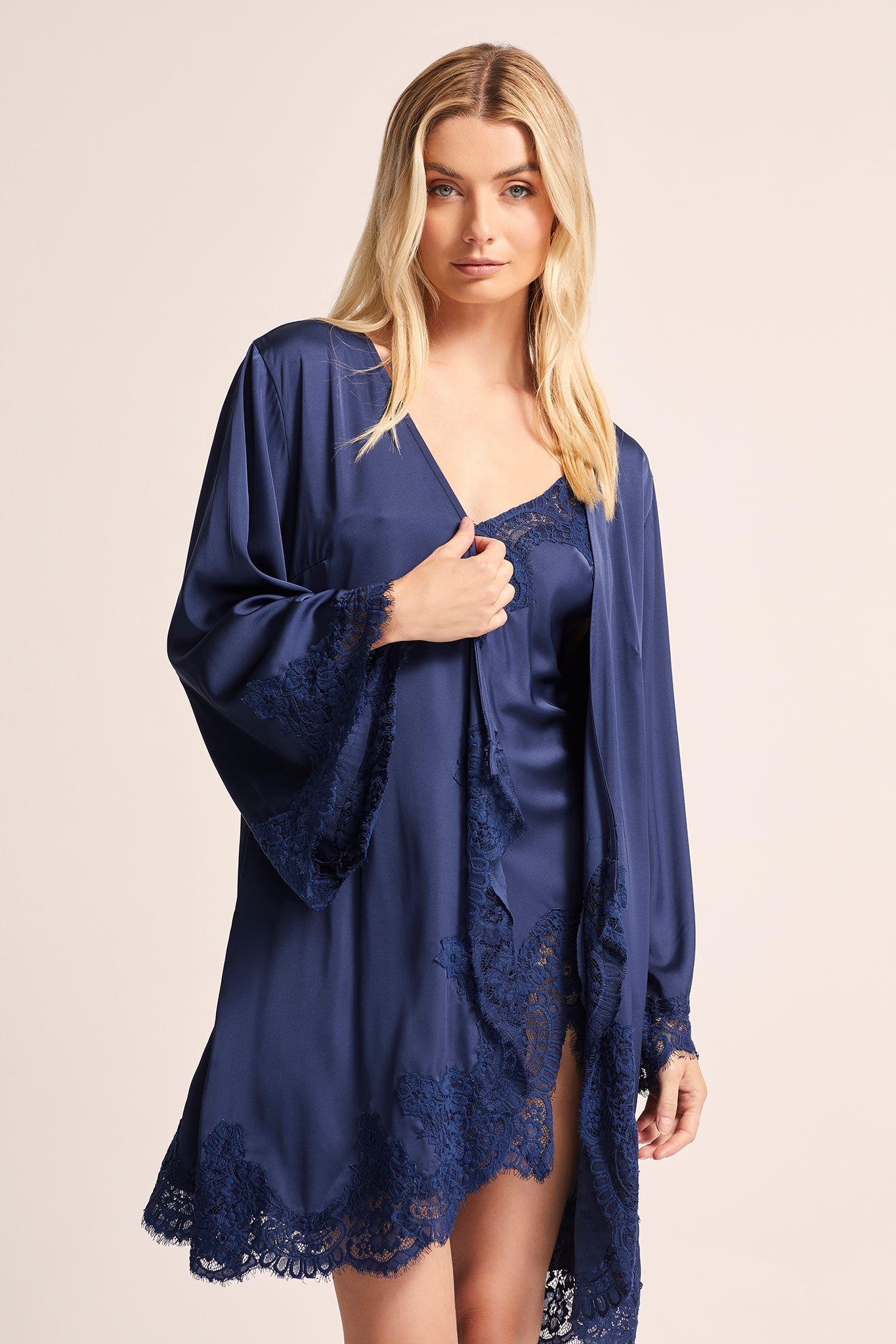 Indulge in the elegance of our Sian Lace Slip, crafted from luxurious silky navy satin with a touch of stretch. The bias cut design hugs your curves beautifully, while adjustable spaghetti straps and a v-neckline, adorned with exquisite lace appliques, add sophistication.