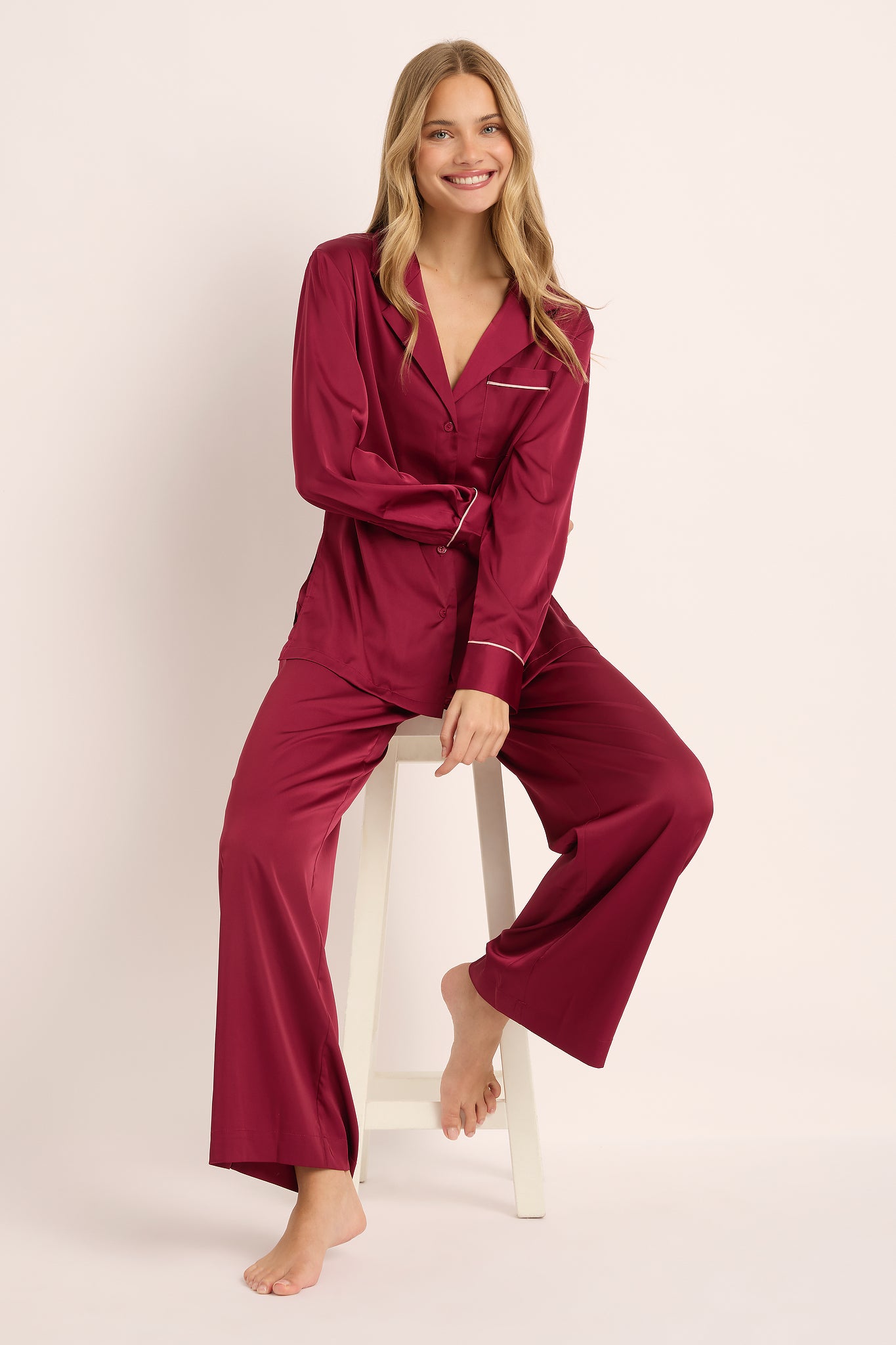 Crafted from our signature premium non-crush satin, the fabric drapes like silk and feels sumptuously soft against the skin, while its subtle sheen adds a festive glow. Whether you're unwrapping gifts by the tree or enjoying a quiet night in, the Grace Pyjama Set promises effortless sophistication from dusk till dawn.
