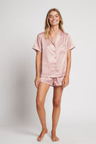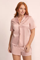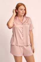 Experience the perfect fusion of timeless sophistication and unparalleled comfort with homebodii®'s Toni short sleeve satin pajama set. The self-colored satin buttons add a touch of vintage Hollywood glamour, evoking a sense of classic elegance. Meanwhile, the elasticized shorts are thoughtfully designed to ensure you have the most dreamy and comfortable sleep.