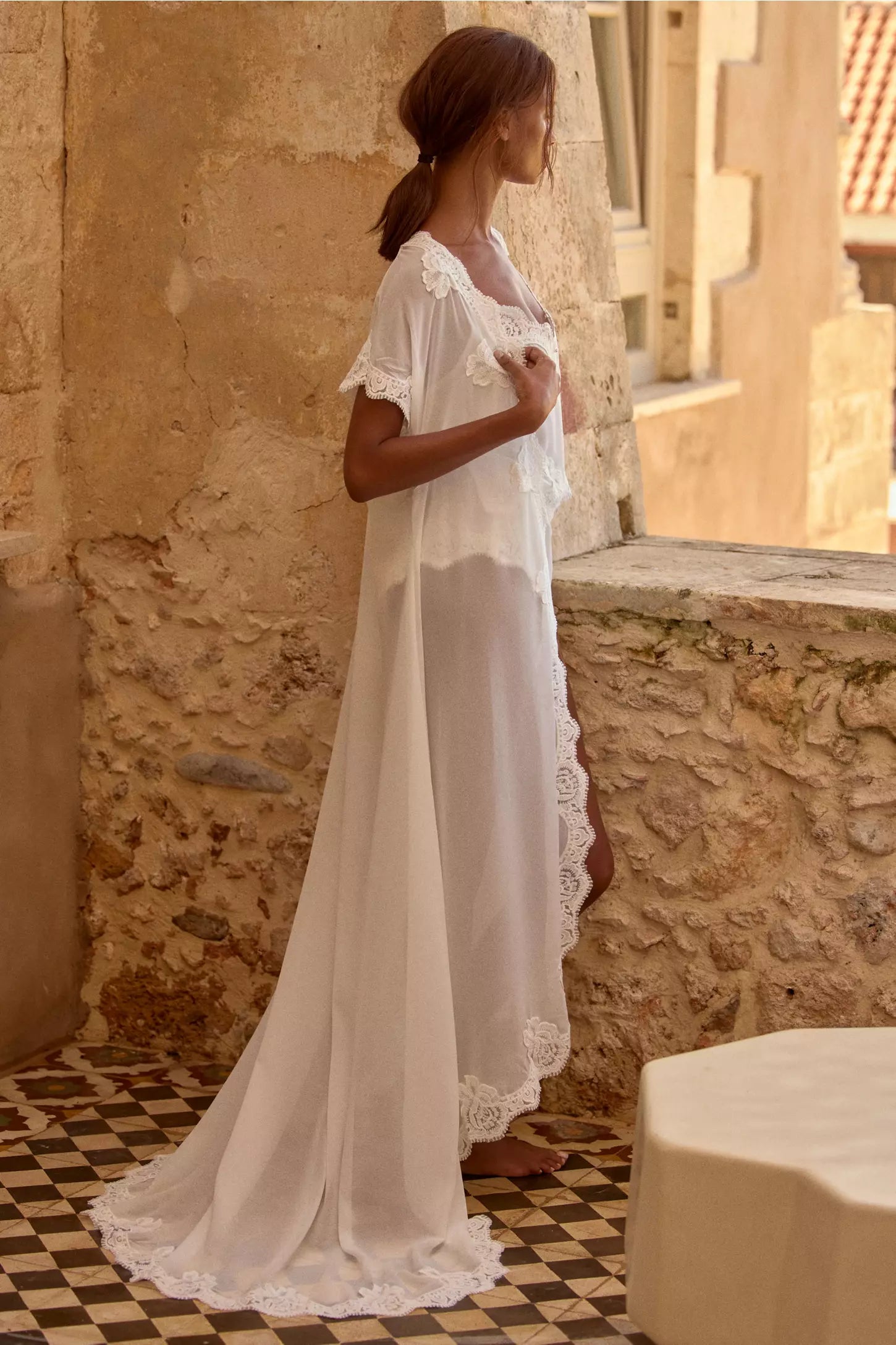 Elevate your loungewear with the Homebodii Valentina Robe, a perfect blend of timeless elegance and modern sophistication. Crafted from luxurious chiffon, this robe drapes effortlessly over the body, creating a flowy and graceful silhouette. The intricate lace detailing along the neckline and sleeves adds a delicate, feminine touch, while the robe’s high-low hemline brings a contemporary twist to its classic design.