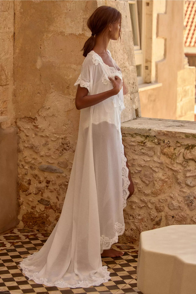 The short sleeves offer a light and breezy feel, making it ideal for warmer days or layering over your favourite sleepwear. Whether you're getting ready for a special occasion, enjoying a relaxing morning, or embracing a quiet evening, the **Valentina Robe** envelops you in luxury and style.