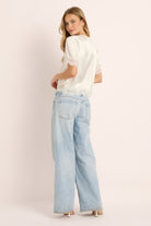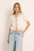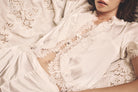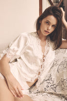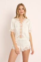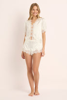 The top is delicately adorned with intricate floral cotton lace tracing the neckline, shoulders, cuffs, placket, and hem. Buttons trail down the center front, adding a nostalgic, heirloom finish. The matching shorts mirror this softness, creating a relaxed yet refined silhouette designed for languid mornings and moonlit evenings.