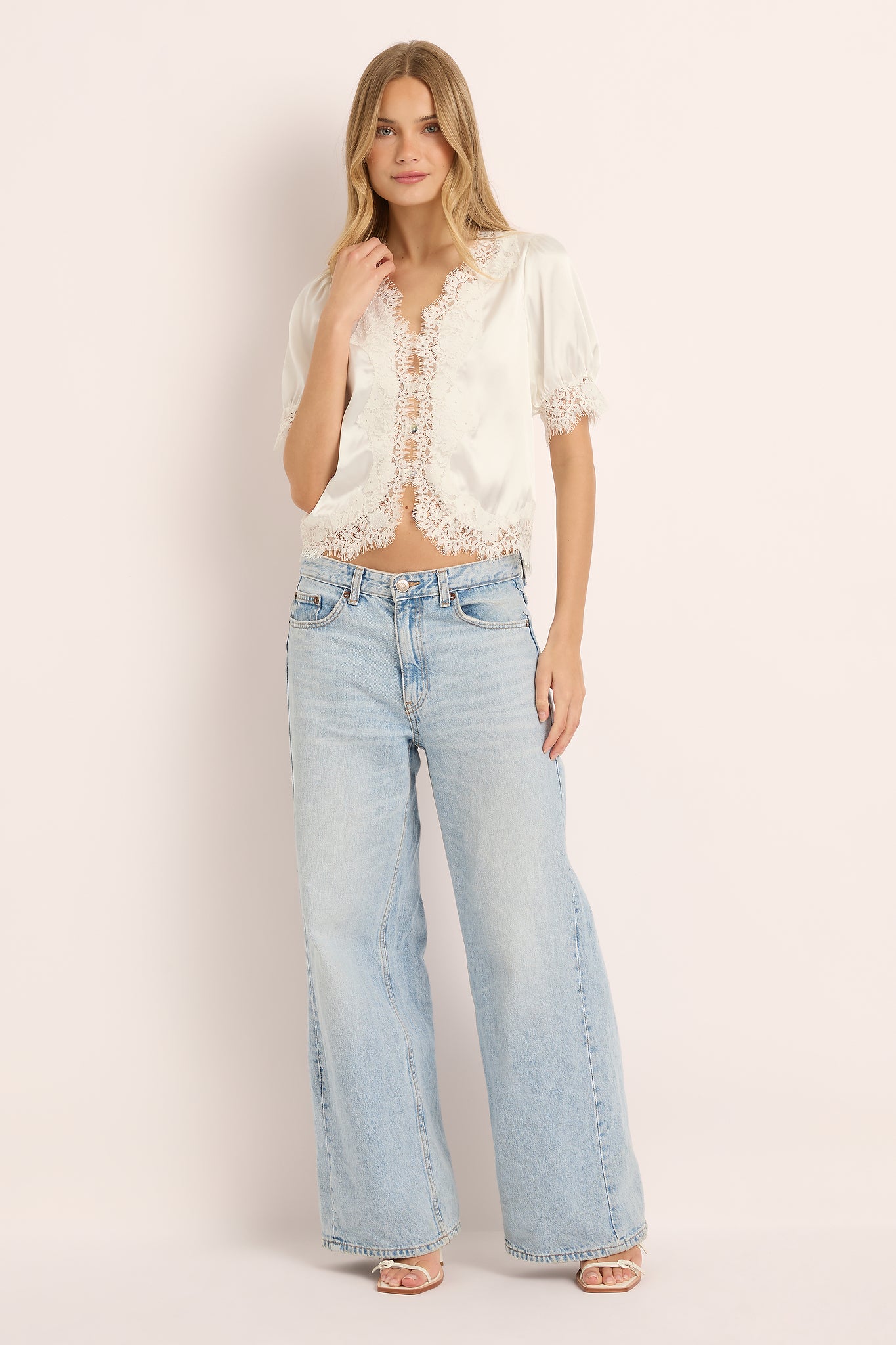 • Lace-covered button front