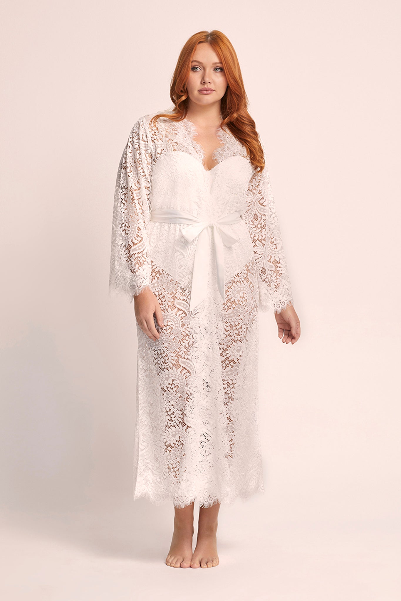 Descend the grand staircase in the exquisite homebodii® Anemone lace robe, an absolute must-have for both bridal and overswim occasions. As you step down, you'll be transported to a time of timeless beauty and elegance, embracing a bygone era's allure.