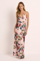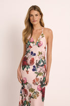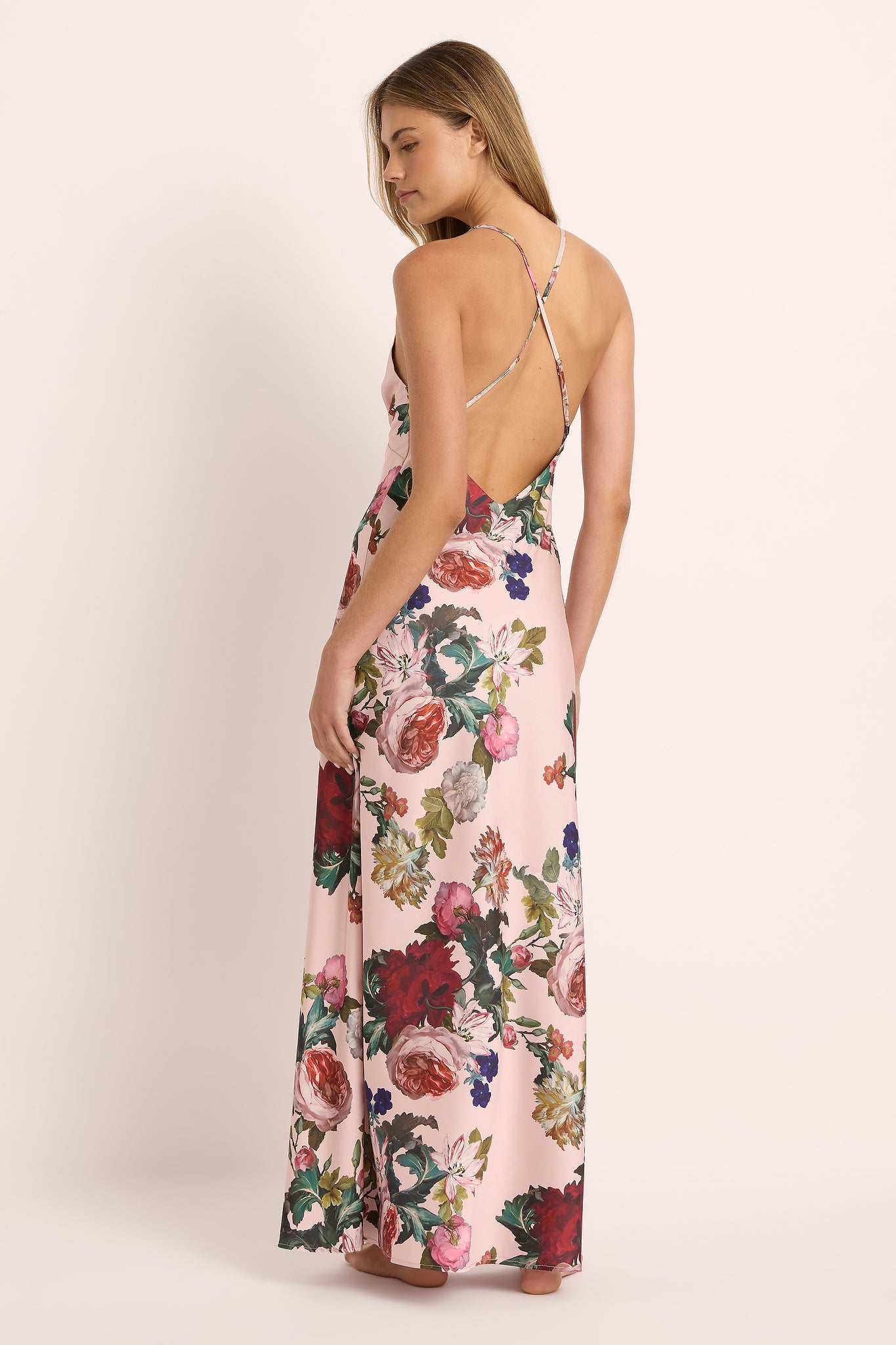 Its delicate blush floral print evokes garden mornings and golden-hour glow, while adjustable straps and a gently flared bias cut create an elegant, flattering silhouette. Perfect for bridal moments, self-care rituals, or simply feeling beautiful at home, the Aurora Maxi Slip embodies Homebodii’s signature harmony of luxury and comfort.