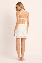 A romantic modern classic. The Celestine Lace Mini Skirt by Homebodii is crafted from lustrous white satin and finished with a delicate eyelash-lace hem. Designed to flatter and move gracefully, this piece captures the beauty of a wedding morning and the elegance of life beyond it.