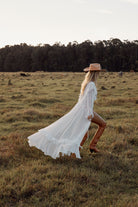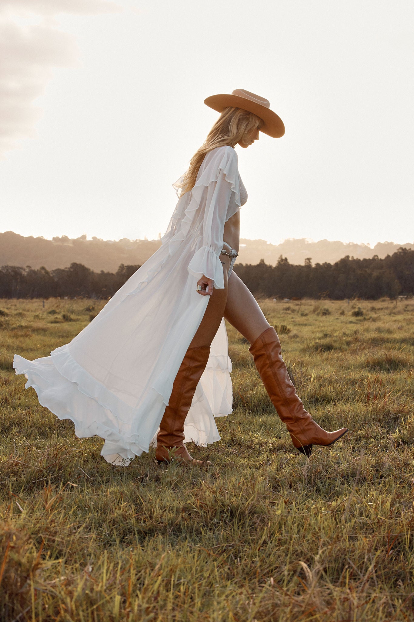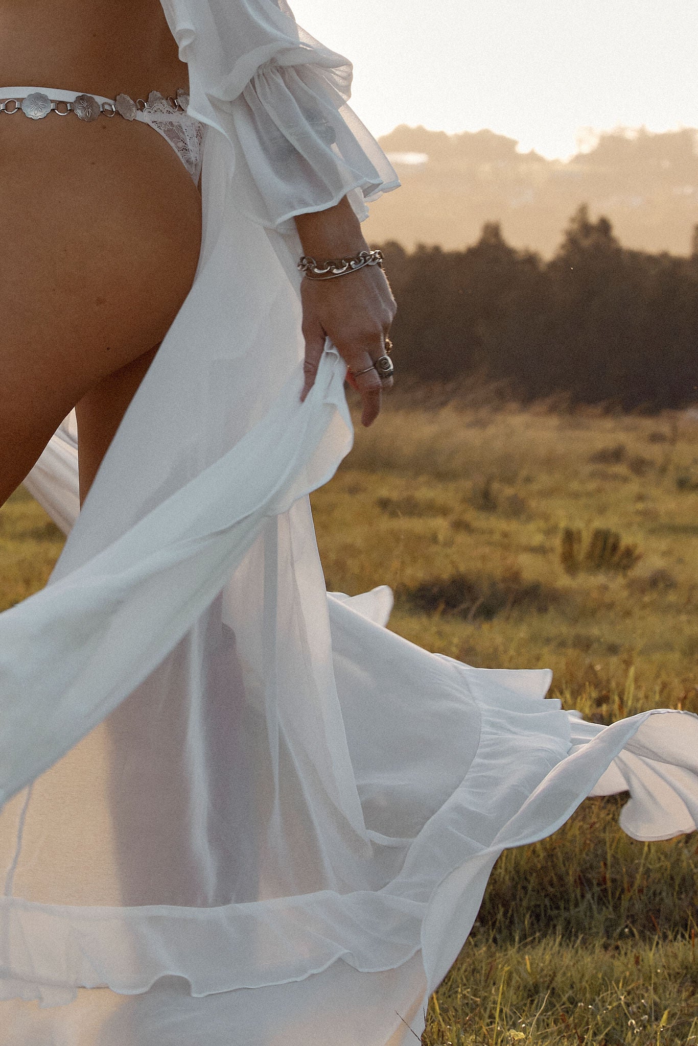 The Persephone Robe by Homebodii is a stunning and feminine style that exudes elegance, making it the perfect choice for springtime. Crafted from a soft and sheer chiffon fabric, this robe offers a delicate and luxurious feel.