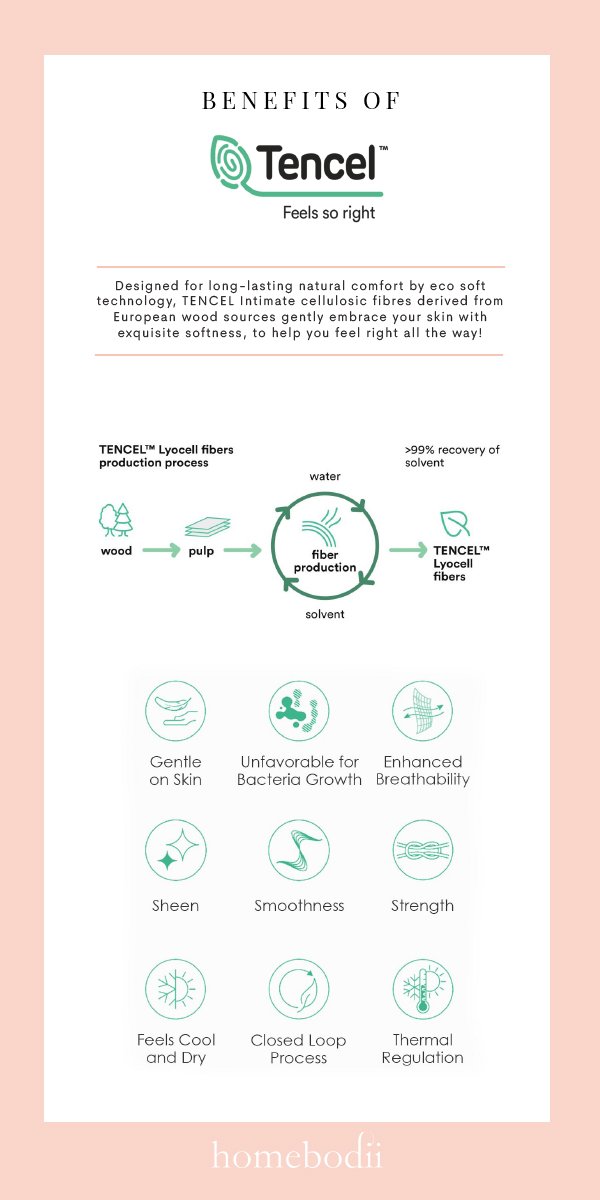 By utilizing TENCEL™ a distinctive fibre known for its sustainability, our manufacturing process actively contributes to reducing environmental waste, preserving foresty ecosystems, and addressing soil acidification concerns. The result is an exceptionally soft fabric that delivers a creamy, cooling sensation against the skin and a range of skin-friendly benefits. It possesses antibacterial and antimicrobial properties. Offers a cool-to-the-touch experience. Effectively prevents itchiness. Sweat-wicking, naturally deodorising, and cooling fabric. Experience our luxurious soft TENCEL™ material.