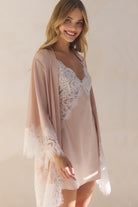 Delicate lace trim graces the sleeves and hem, adding an element of timeless romance, while the self-tie waist allows for a flattering, adjustable fit. Whether you're starting your morning routine or unwinding in the evening, this robe is the perfect blend of sophistication and ease.