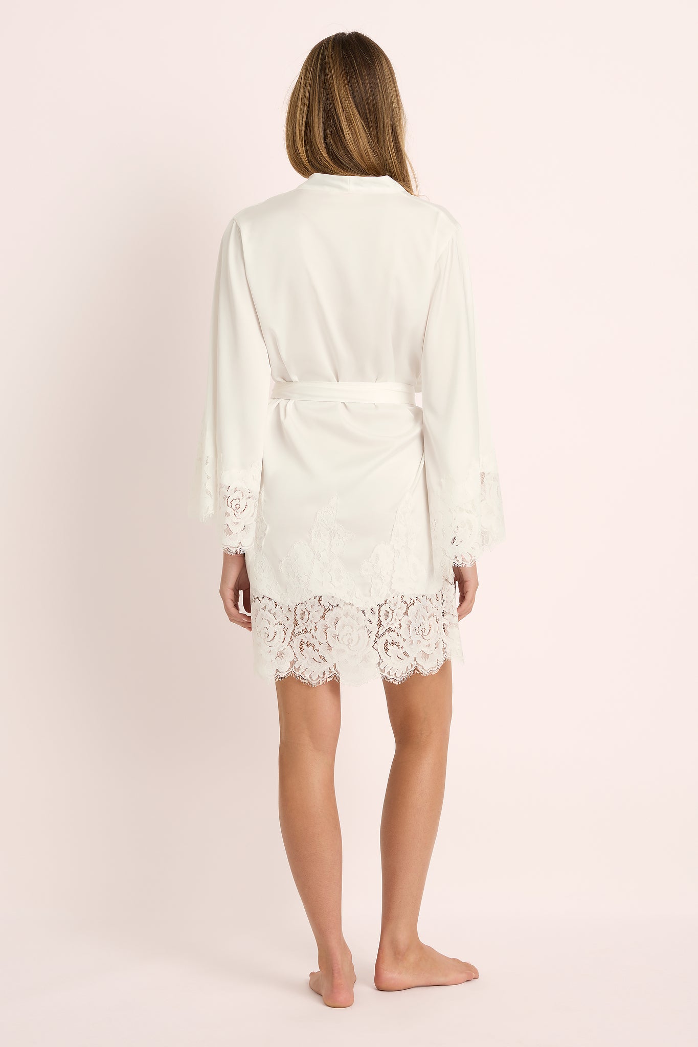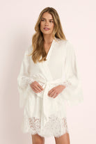 Delicate lace trim graces the sleeves and hem, adding an element of timeless romance, while the self-tie waist allows for a flattering, adjustable fit. Whether you're starting your morning routine or unwinding in the evening, this robe is the perfect blend of sophistication and ease.
