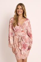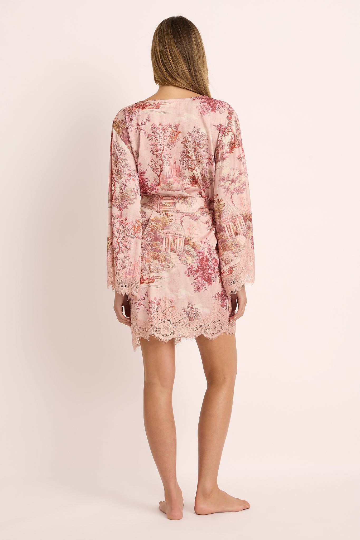 A robe that feels like stepping into a French daydream. The Toulouse Short Robe captures the romance of vintage European landscapes with soft blush tones brushed with scenes reminiscent of pastoral toile de Jouy art.