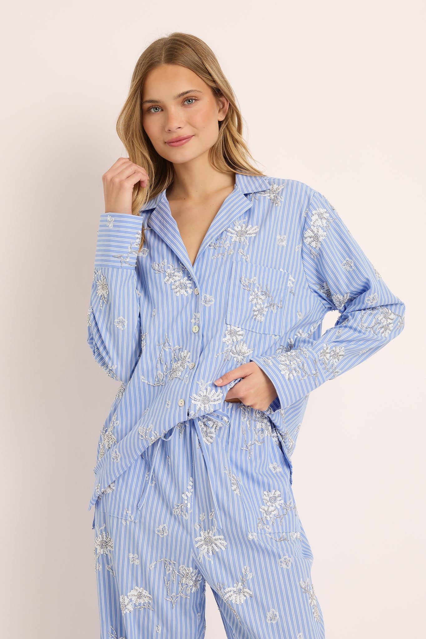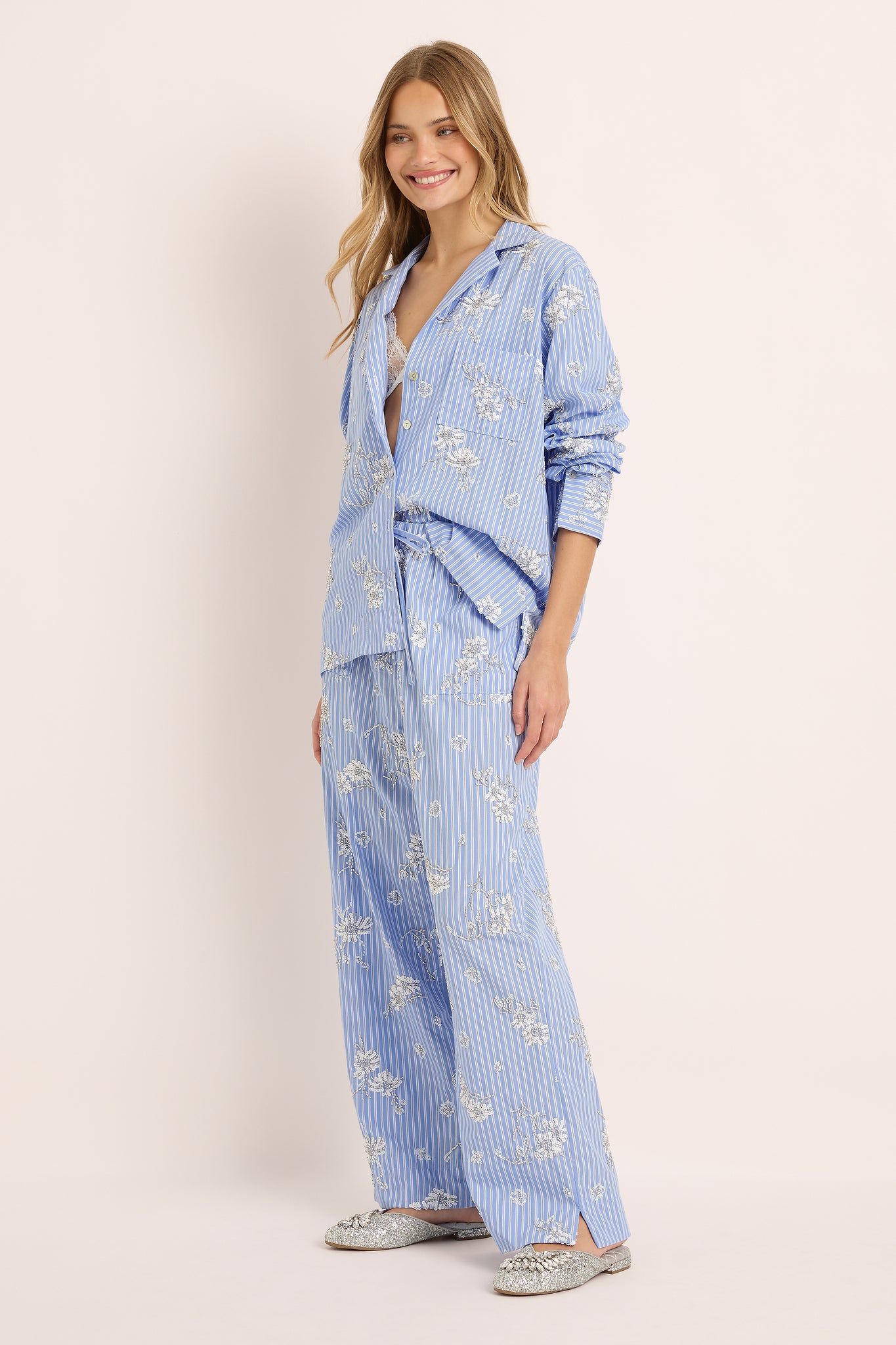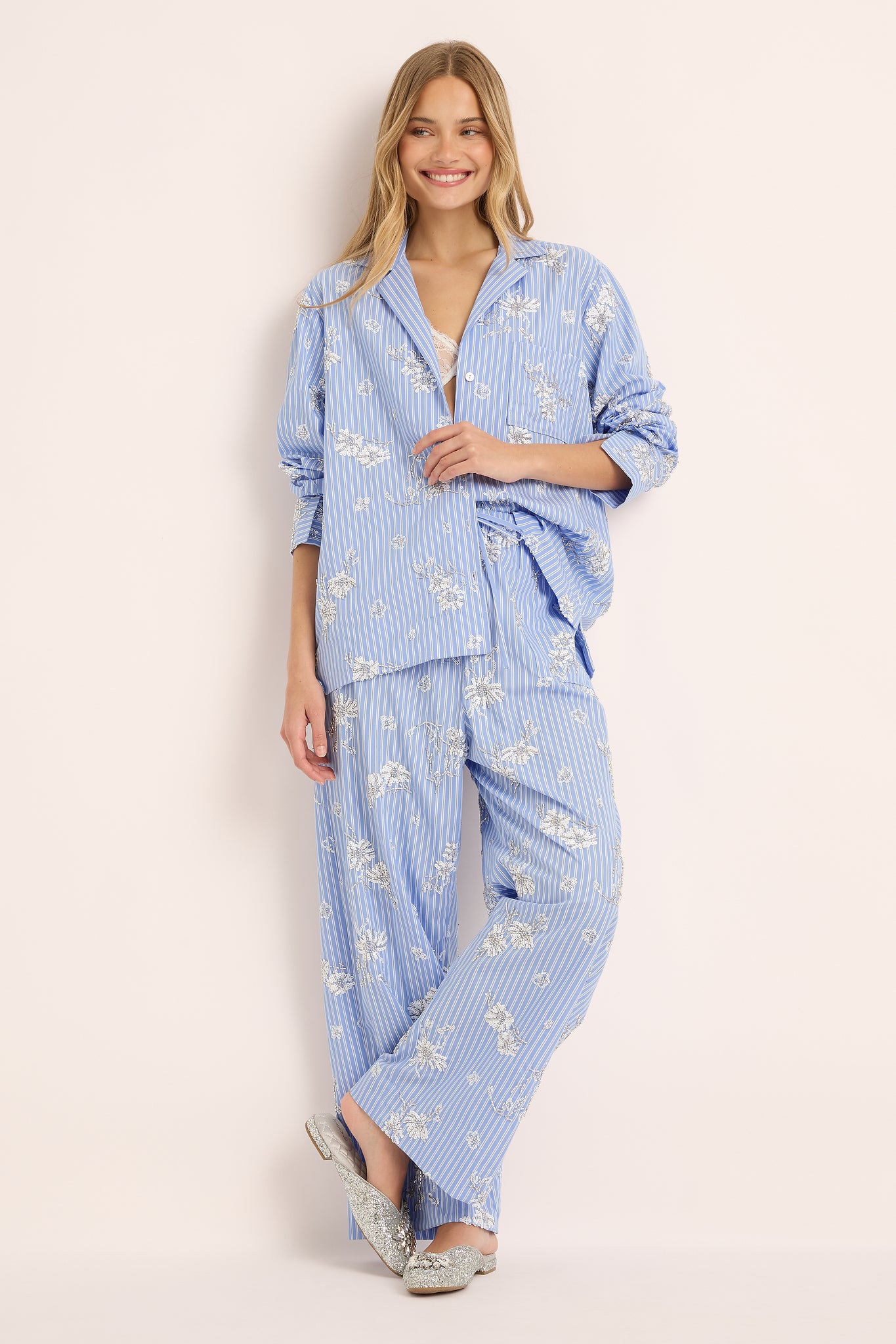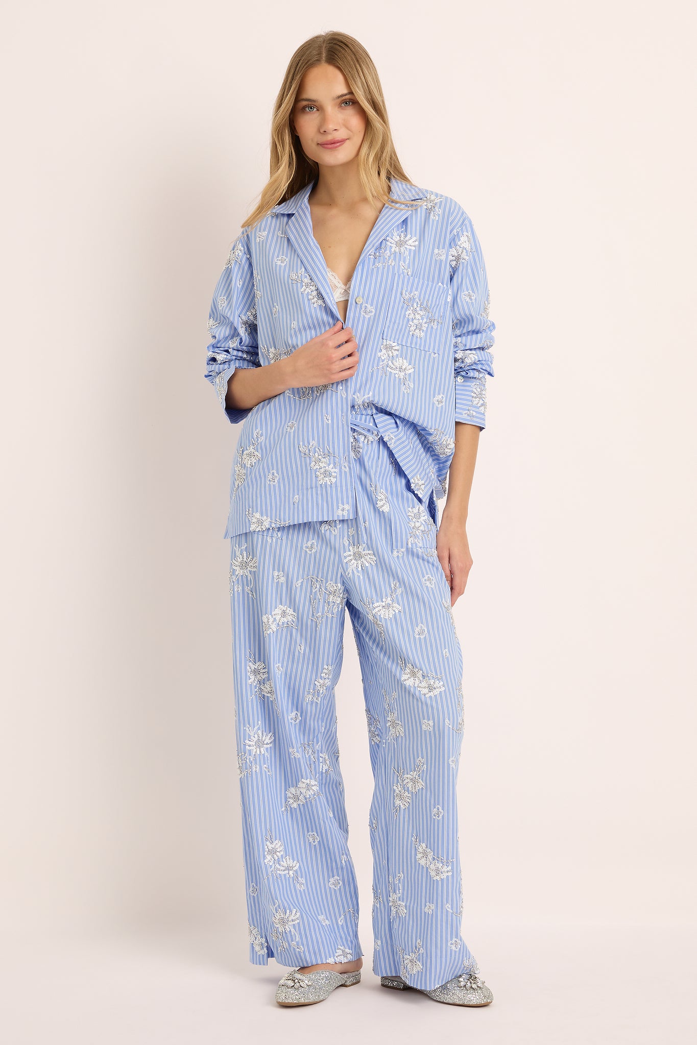 Each detail from the of the subtle shimmer of bead work celebrates artistry and grace. The relaxed button-up shirt and wide-leg pants offer a fluid, flattering silhouette designed to move beautifully from at-home lounging to sophisticated daywear.