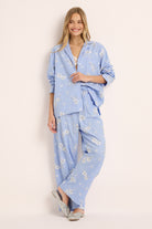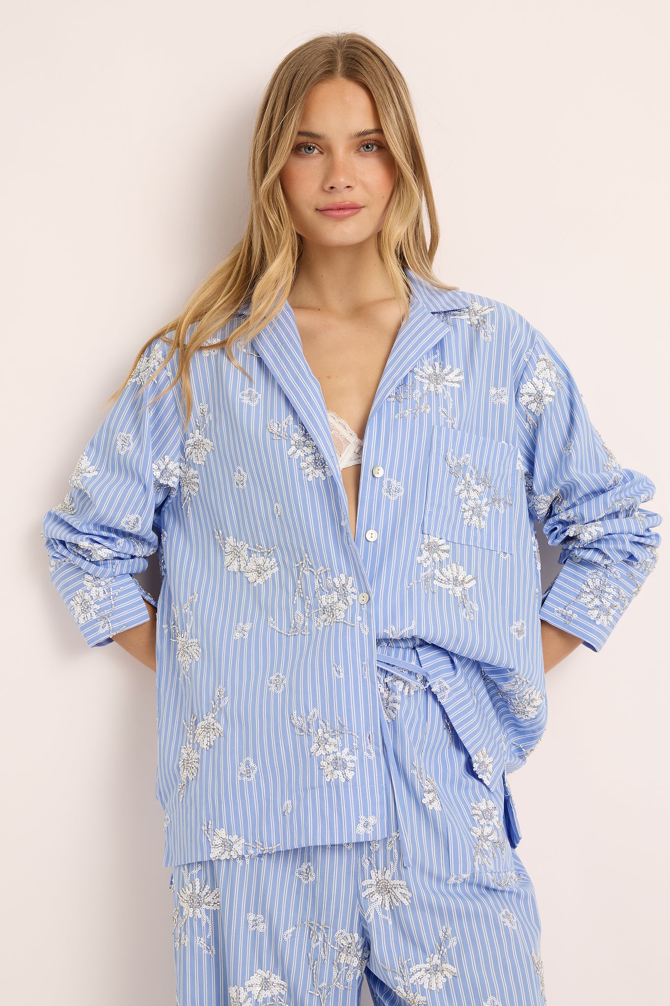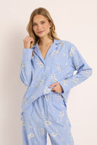 The Homebodii Vivienne Beaded Lounge Set is where timeless craftsmanship meets modern femininity. Made from 100% cotton, this soft blue striped set is adorned with delicate hand-beaded embellishments, transforming everyday comfort into a true statement of style.