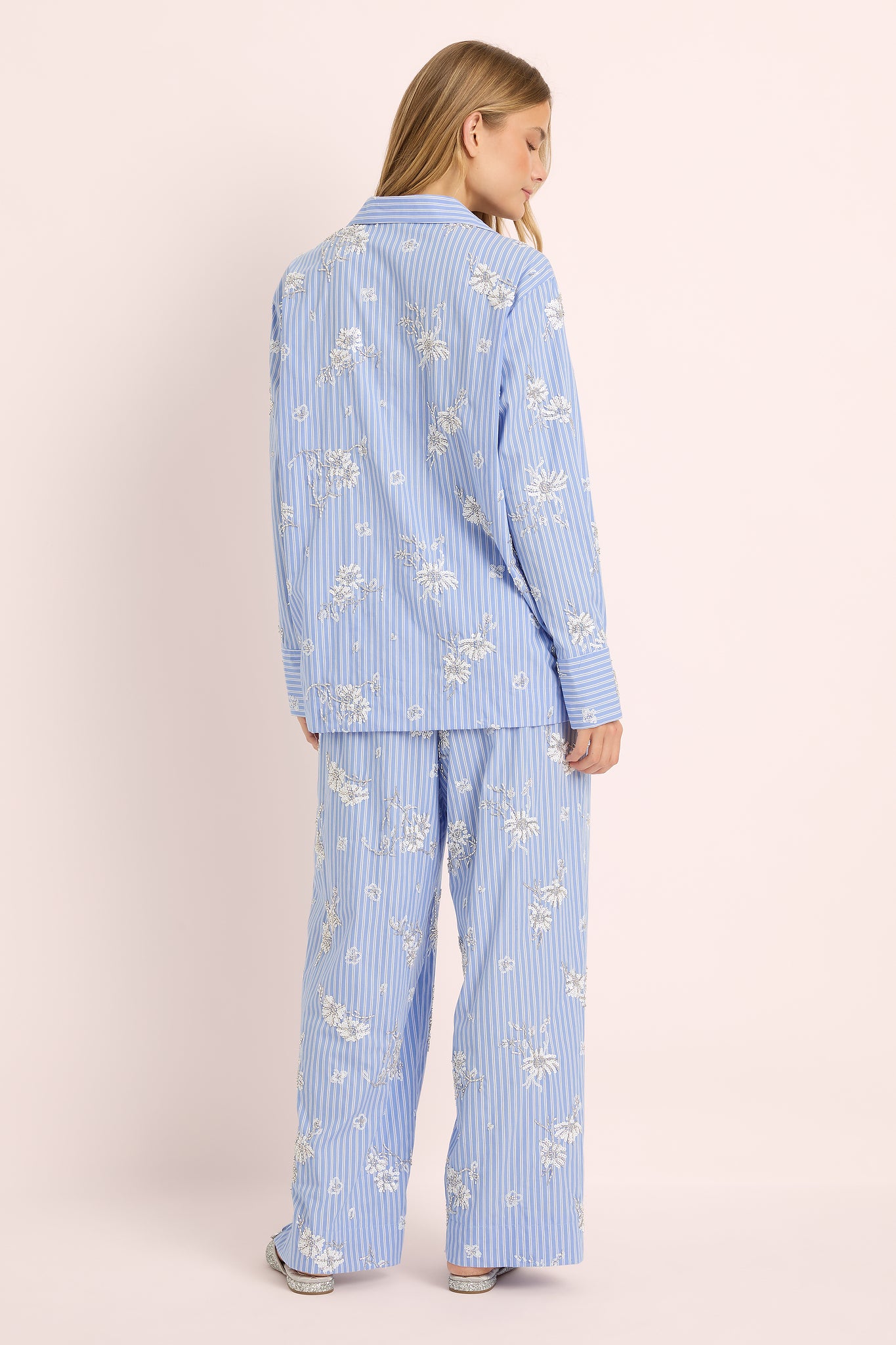 Soft pink stripe adorned with hand-beaded floral detailing